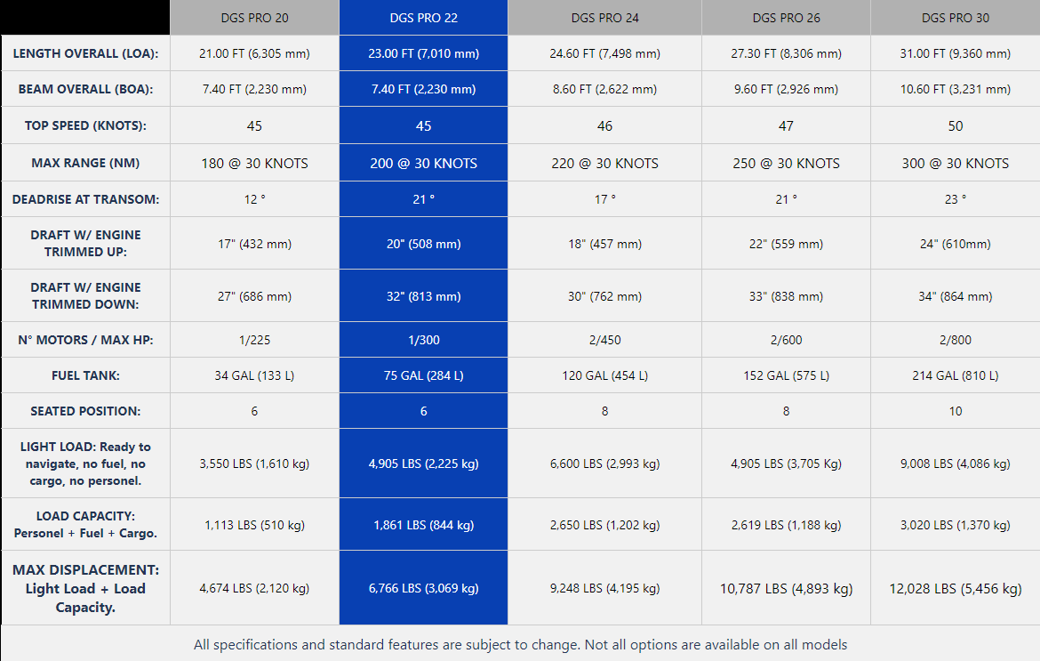 Built for performance and versatility, DGS Pro 22 offers a stable and reliable platform for operations in various maritime scenarios. Combining power and maneuverability, it is an excellent choice for law enforcement missions, search and rescue, and safe personnel transportation.